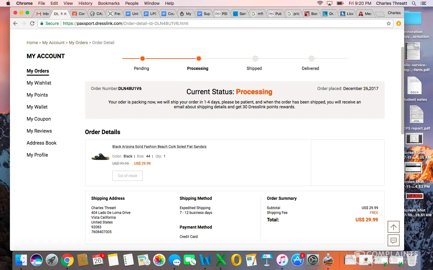 I am requesting a refund for my Black Arizona Solid Fashion Beach Cork Soled Flat Sandals. My order number is: DLN84U1V6. I paid $29.99. I ordered sandals on December 26, 2017 and it is now January 26, 2018. I have called the number online and tried to reach out. I have logged into my account and it has said Processing since I placed my order. About two weeks ago (1/05/18) it stated that the item will ship in 1-4 days. Today (1/26/18 it still says the same thing.) I've waited patiently but I have not received any other information. I would like my item to be shipped immediately or a full refund of my money. I read great things about this company online prior to my order and this seems quite frustrating that this has been my experience.
