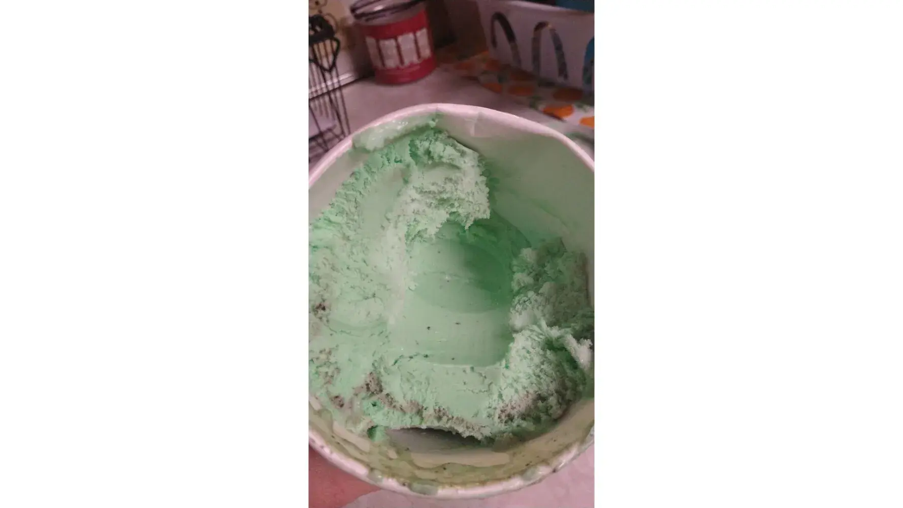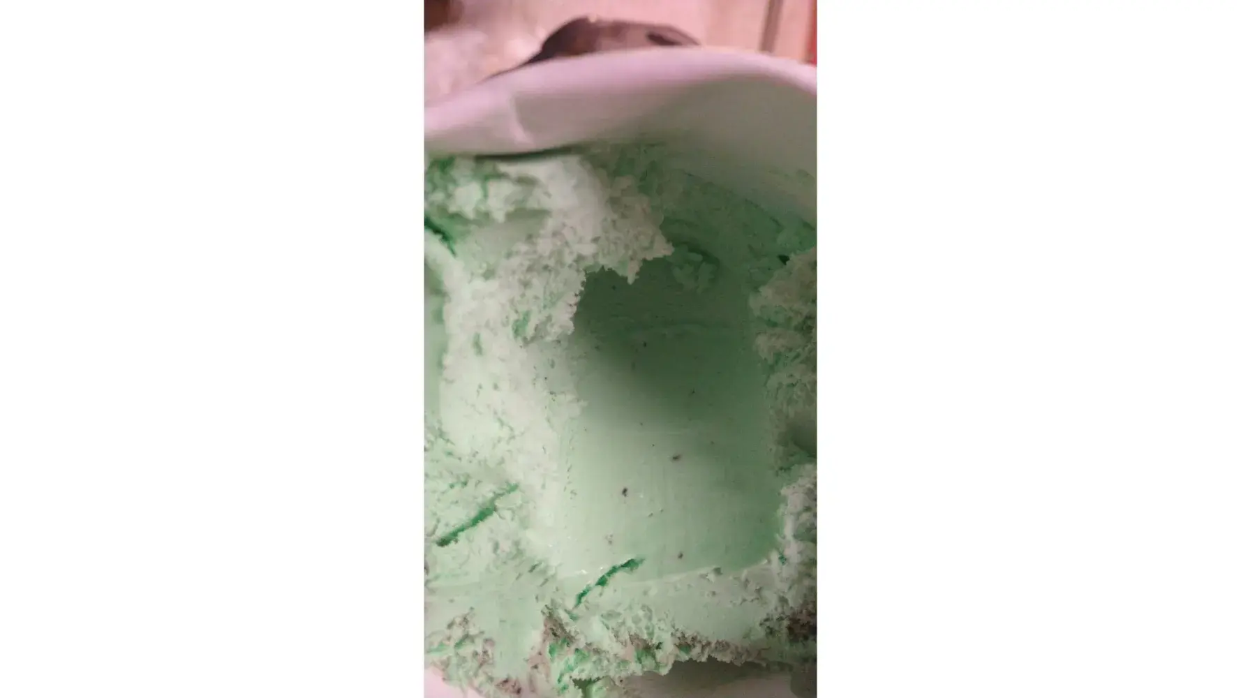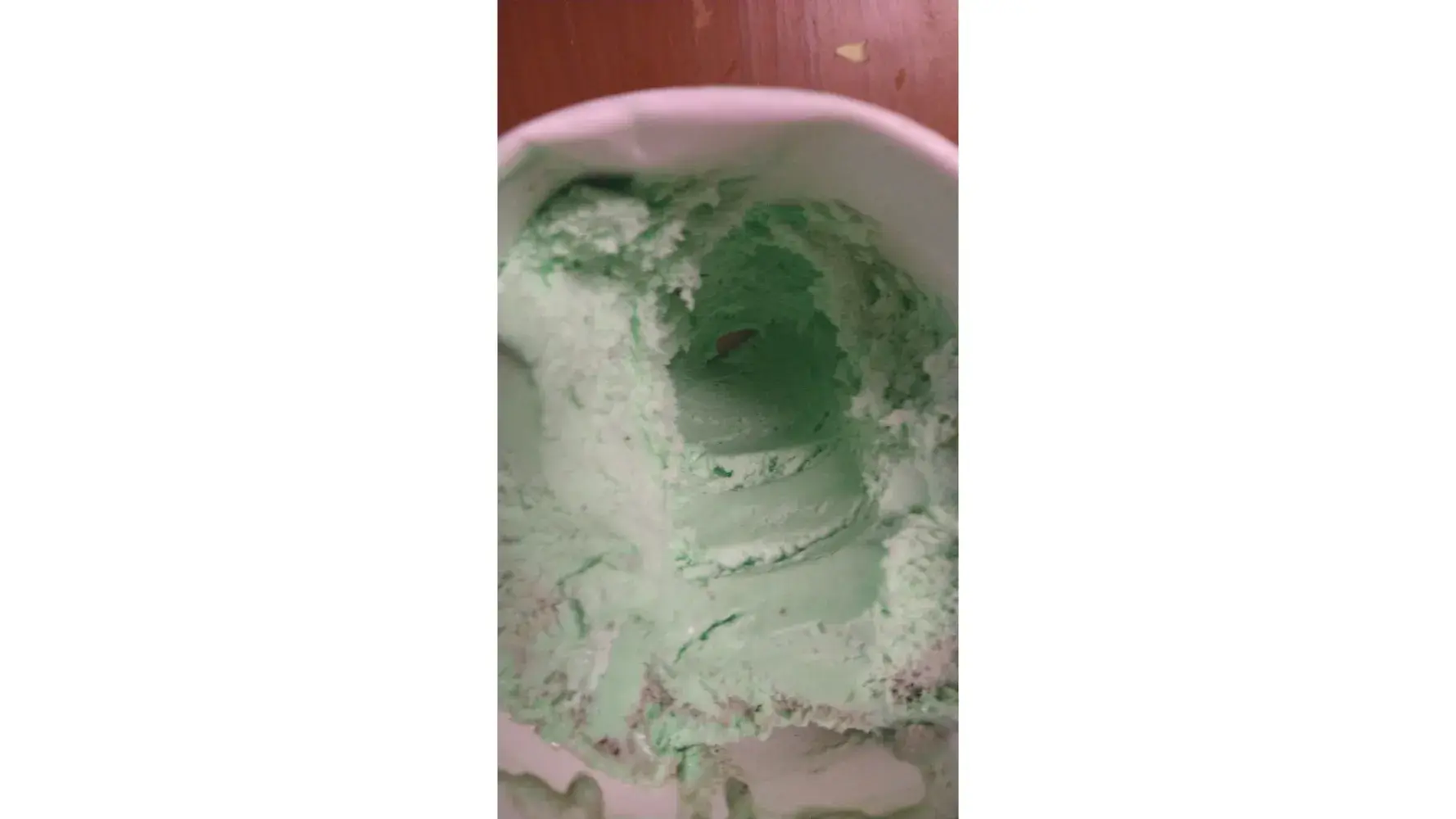 Purchased a 1.5 quart tub of ice cream and put in my freezer 8 minutes later when I got home. 3ish hours later I opened container to find there was a void in the center that appeared melted out, It was not created by a spoon or fork, it was very smooth. I was able to pour 1 1/2 cups of milk into the void to bring the level up to the surrounding ice cream. I used milk so I could drink the milk afterwards and not waste it like if I used water. It was very frustrating as I love the Dreyer's slow churned ice cream.