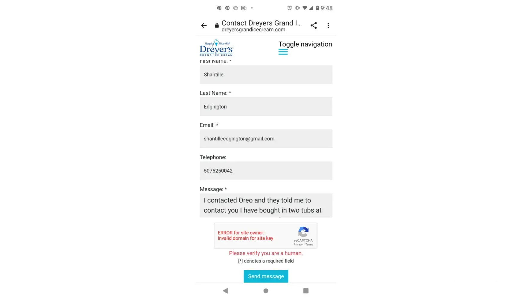 I have purchased two half gallons at our local Dollar General for $5 each and neither one have Oreo pieces in them. I am very disappointed and upset cuz it is false advertisement what is pictured on the front cuz it definitely is not what is inside the container. I contacted Oreo and they told me to contact you to get this resolved. I would like to be contacted especially since I've tried to put in a complaint already which I screenshot below and sent and your website won't allow it. It's very disappointing for a company so big to have this poor of customer service and quality control