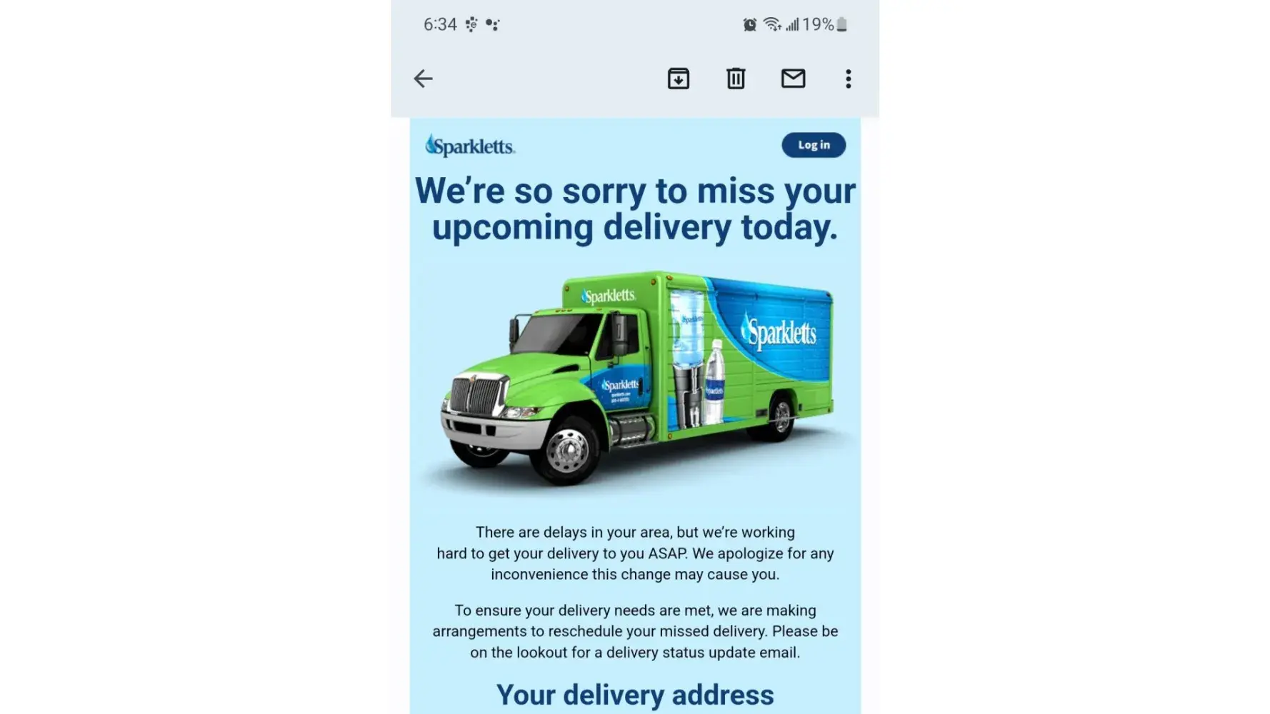 Thank you for contacting us via email in regards to delivery of water. We apologize for any inconvenience that you may have experienced.