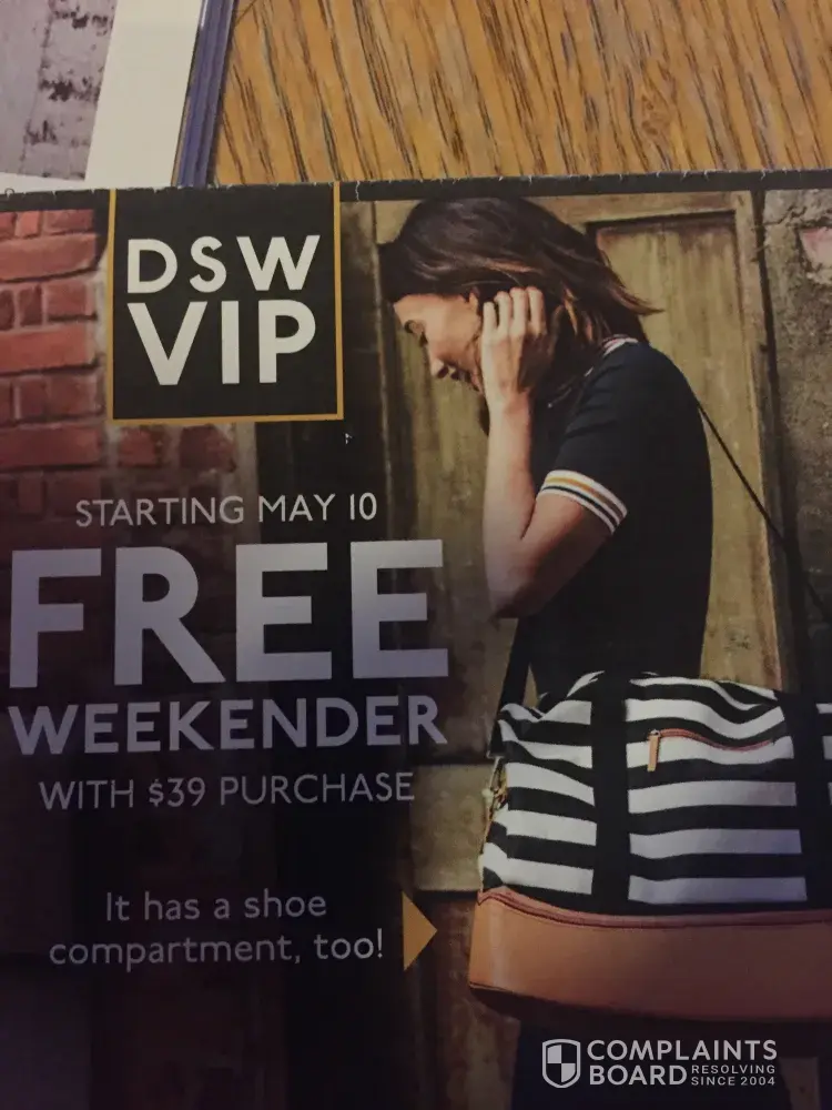 I received a coupon in the mail to be able to receive a free weekender bag with the purchase of $39 sale started on May 10 today is May 12 I went to the store today May 12 and they told me they were out and they are not giving other bags and replacement I'm not a happy customer I went there specifically because the bag is adorable and I really wanted it to go on a cruise that I'm attending and to be able to rave about how DSW takes care of their customers they did not I've tried calling twice the first time I was told I have a 212 minute wait in the second time 308 minute wait that is a joke. I want that bag for free like my coupon says. So if someone could contact me & id be happy to provide my information so you can send it to my house I'd appreciate it