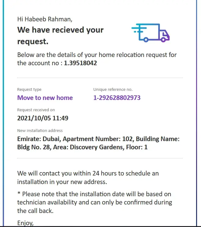 b) they had asked me to share the new premisis Ijari document as my new premisis doesnt have DU facility and only Ethisalat is installed from the building. but again despite of sending the document there is no action but again unwanted question is asked time and again.