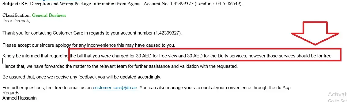 DU DECEPTION: DU TELECOM OVERCHARGES - wrong packAge -account number(1.[protected]).