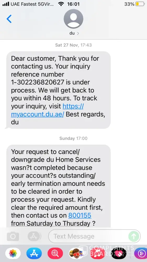 I joined Du via a salesman who was in my apartment block. He told me that there would be no fee to cancel but I would need to give notice. I first rang customer service to give notice on 16 Nov. After 1 hour of ringing, and no one picking up, I tried to cancel through my app. The next day it was declined because of an ‘outstanding/early termination' amount. There is no amount on my app. I went to Mall, lodged a complaint, received a text saying they would call within 7 hours. No call. The next day, another message about an outstanding amount. I am now in another Mall at a concession. They tell me that I can only close through my app. The situation is absurd. For three weeks I have been trying to do the right thing! Thus is terrible customer service in a country that prides itself on service to its people!