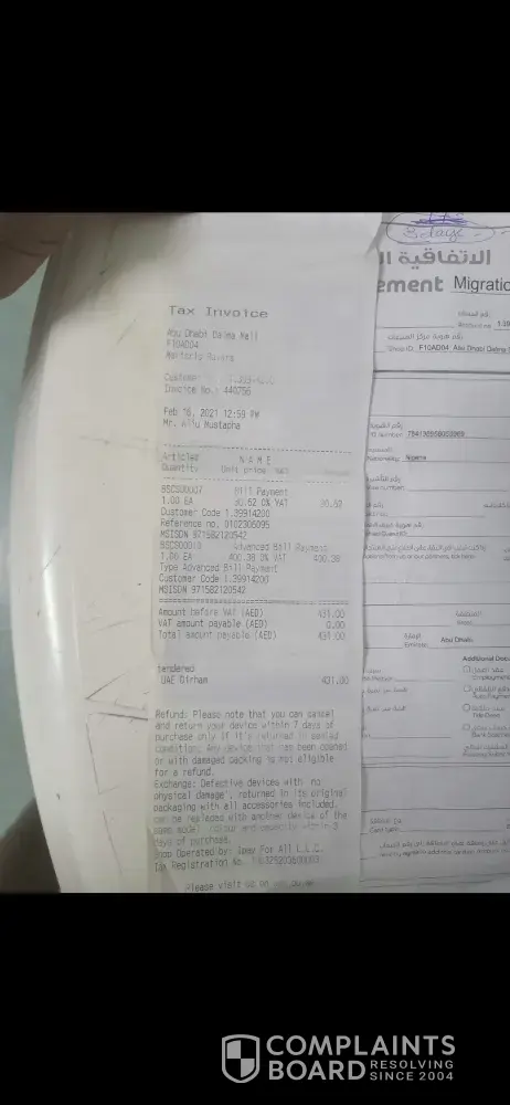 تم Ø¯ÙØ¹ رسوم الهجرة المدÙوعة مسبقًا بØÙ„ول شهر ÙØ¨Ø±Ø§ÙŠØ± وتم ØØ¸Ø± رقمي [protected]+ بعد Ø¯ÙØ¹ رسوم غير قانونية وخدعة. الرسوم البالغة 439.26 درهمًا باطلة. كي٠يمكنك تسجيل الرسوم على ØØ³Ø§Ø¨ ØØ¸Ø± جزئي. ماريسريس Ø±Ø§ÙØ§Ø±Ø§ ÙÙŠ ÙØ±Ø¹ دلما مول هو الذي Ø¯ÙØ¹Øª له. وقد تم إبلاغي بأنه سيتم ØØ¸Ø± بطاقة Sim الخاصة بي لمدة 3 أيام بعد Ø§Ù„Ø¯ÙØ¹ لعملية الترØÙŠÙ„ ØŒ اتصل بإخطار الإدارة لإجراء ÙØØµ شامل Ù„ØØ³Ø§Ø¨ÙŠ Ø¨Ø§Ø³ØªØ®Ø¯Ø§Ù… رقم الهات٠المØÙ…ول +[protected]. تم ØØ¸Ø± رقمي لمدة 3 أشهر Ùˆ 6 أيام الآن بدون سبب. لقد تقدمت بشكوى شديدة بعد Ø¯ÙØ¹ المبلغ الإجمالي والجميع يواصلون خداعي ØØªÙ‰ اليوم. لقد قمت Ø¨Ø¯ÙØ¹ مبلغ الإلغاء ÙÙŠ ÙØ±Ø¹ دلما مول إلى ماريكريس Ø±Ø§ÙØ§Ø±Ø§ قسم خدمة العملاء. بعد Ø§Ù„Ø¯ÙØ¹ الإجمالي قامت بطباعة الإيصال وإثبات Ø§Ù„Ø¯ÙØ¹ الذي تم استلامه. لقد أعلنت أنه سيتم ترØÙŠÙ„ ØØ³Ø§Ø¨ÙŠ Ø¥Ù„Ù‰ Ø§Ù„Ø¯ÙØ¹ المسبق العادي الخاص بي ÙÙŠ 3 أيام Ùقط وهو 19 ÙØ¨Ø±Ø§ÙŠØ± ØŒ ولم أتمكن من إجراء مكالمة بعد السداد الإجمالي ØØªÙ‰ اليوم. هذه هي الشبكة الوØÙŠØ¯Ø© التي كنت أستخدمها لكنها كانت Ù…Ø¤Ø³ÙØ© للغاية. اتصلت عدة مرات بهات٠أصدقائي ØÙŠØ« Ù…Ùنعت من الاتصال دون سبب. أسعى بكل تواضع للتØÙ‚Ù‚. ها هو إثبات Ø§Ù„Ø¯ÙØ¹.