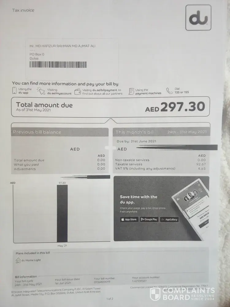 I re-registered my complaint to TRA and next day I received call from DU that they were not able to find any record for 02 accounts out of 03 which were activated on same day. Therefore they have waived off amount of 02 accounts but I have to pay for 01 account.