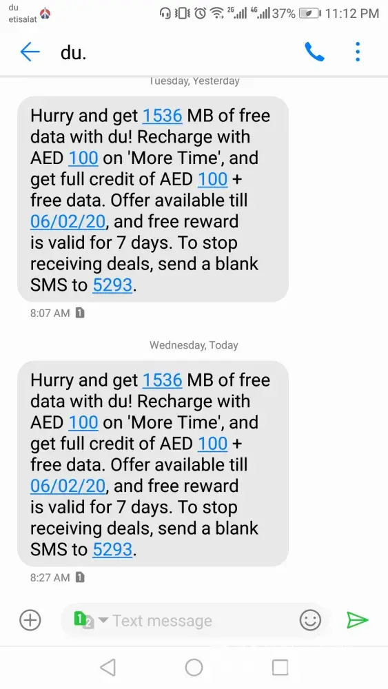 Sms. (Hurry and get 1536 MB of free data with du! Recharge with AED 100 on 'More Time', and get full credit of AED 100 + free data. Offer available till 06/02/20, and free reward is valid for 7 days. To stop receiving deals, send a blank SMS to 5293.)