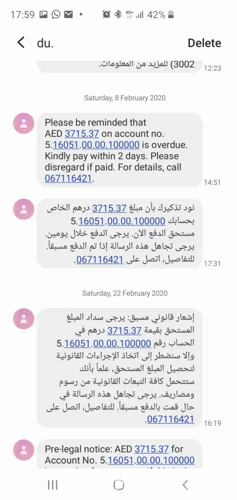 Hi. I have made numerous attempts to contact DU Customer care over the phone in February 2020 but am unable to get through. I keep receiving threatening text messages from DU asking me to settle a third party DU Bill. I had previously called up DU and reported this error in July 2019 and the constant threats stopped. Once again I have now received a threatening text message from DU stating that i have to pay AED 3700 plus legal expenses due to the account which is not mine and in the name of someone called Thomas Theurer of Mivune FZ LLC ACCOUNT NR 5.16051.00. This harassment is unnecessary and not ethical by a company such as DU. Extremely disappointing customer service. Not sure if this is a scam run by DU as it gives a number to call to settle claim. Very suspicious. About time DU look into company malpractice if this is happening.