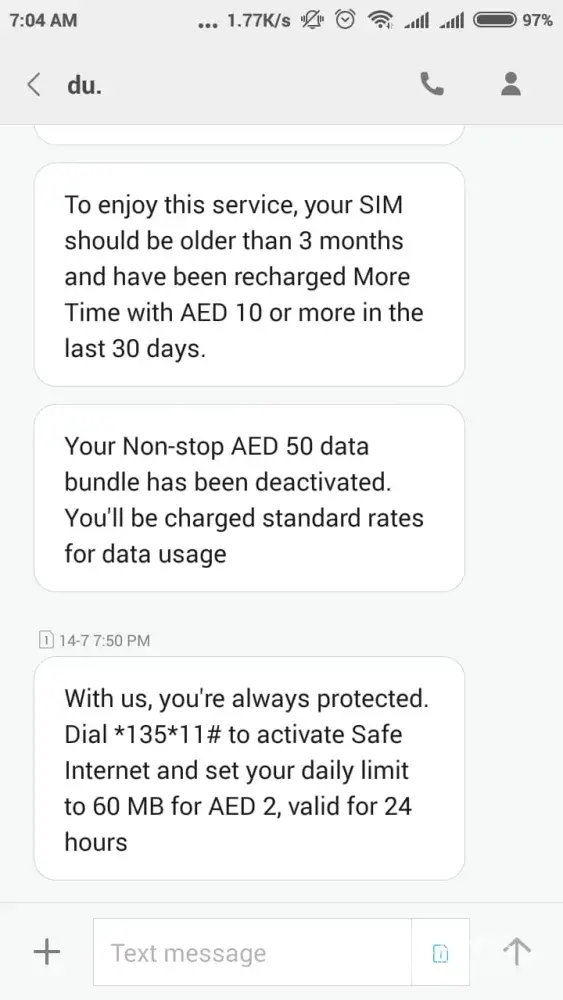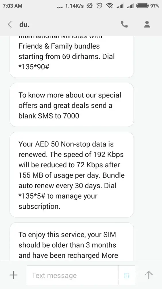 Everytime i recharge 25dhs you will always send me sms telling i subscribe to this and that even if im not!oh and by the way! There's not option to unsubscribe! So amazing! My last recharge is only 2days back and now my 25dhs is gone! Great job du! Your excellent in getting the money of your customer with your VERY POOR SERVICE! If you will continue to be like this! Better yet me and my husband change to ETISALAT!