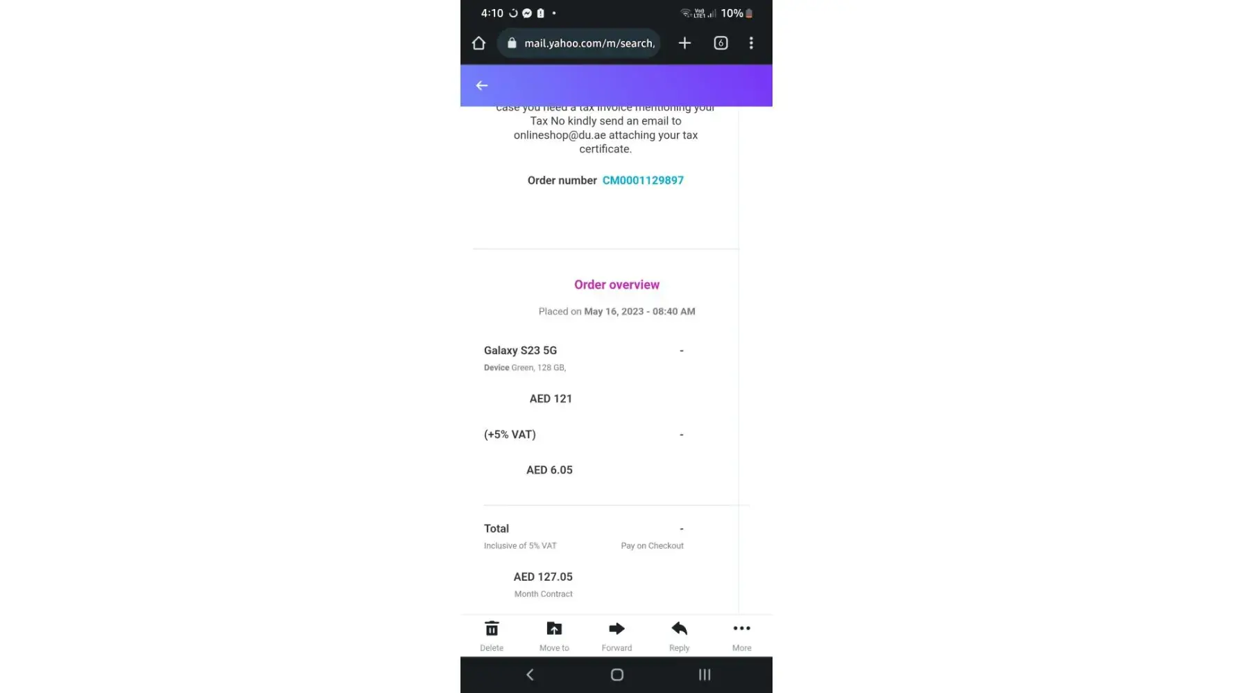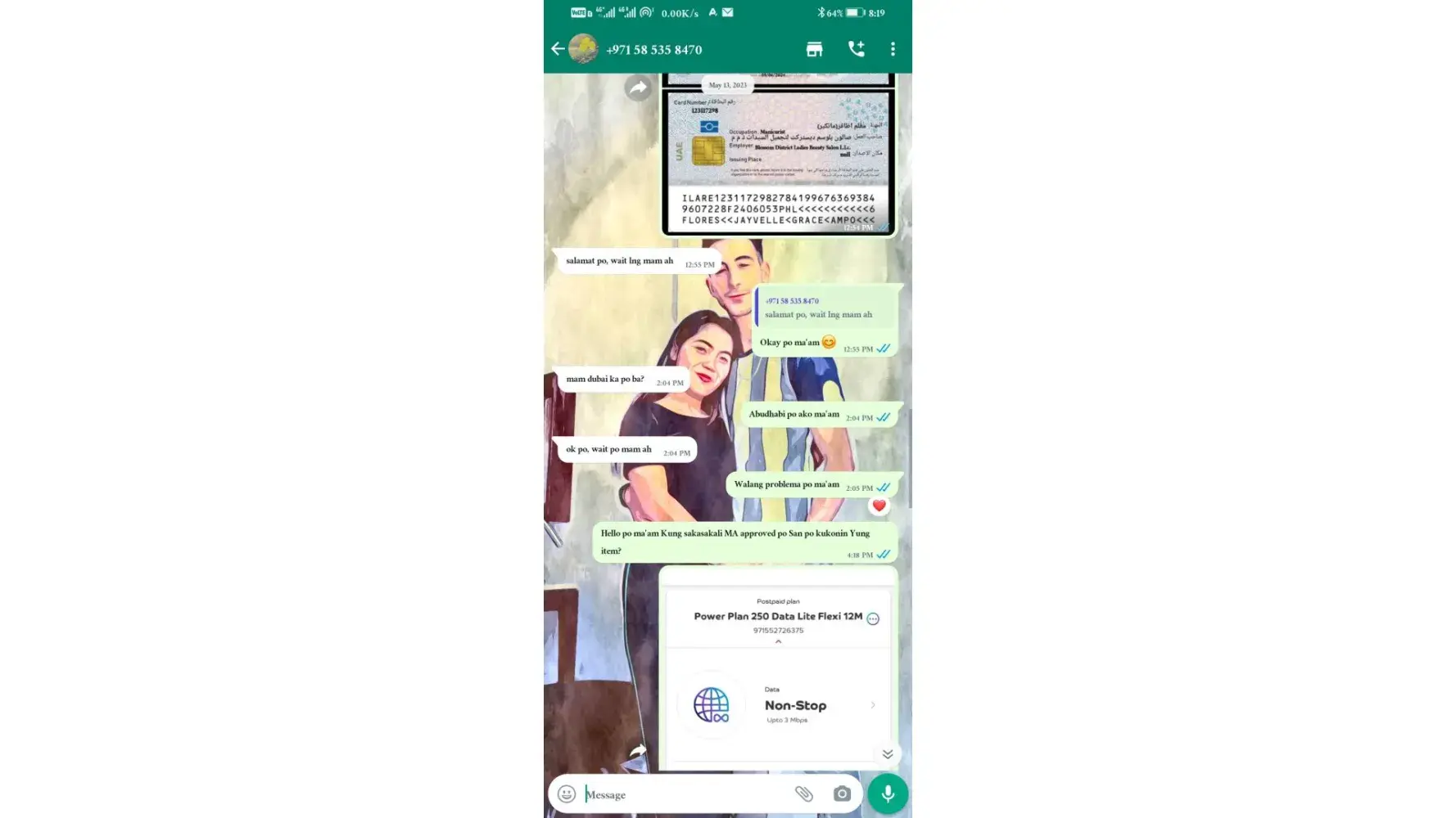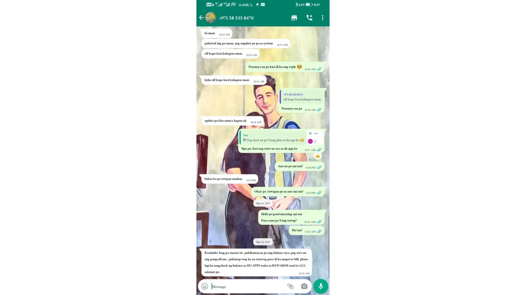 ma'am how are you is it approved already? . No response, the next day Monday. I message her again hello po good ma'am is approved already? Nothing. The next day Monday. May 15 ma'am is it approve already? She replied at this time bit she's saying again wait again because it's updating on their system 'and I even told her sorry for the disturbance it's because you're not replying. And she said I will update you later in the afternoon. And I told her okay because it's already started on my phone number the plan she just react thumbs up on it. This was 10 am so I message her Back 5pm she said someone will call me next morning. So I asked her for what call. may 16. I waited for the call a'd message her she didn't respond at all. So what I did I went to Du store at Hamdan street to check my account if what2 goi'g on a'd Hats under my subscription if it's with phone or without phone because I'm afraid that I will continue paying for it but I didn't received any
