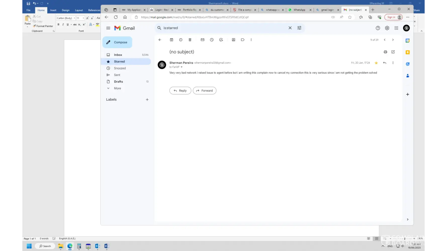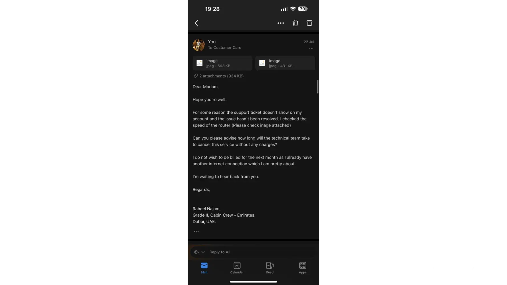 I complained 3 times on their helpline, they gave me complaint numbers, each time their so called technical team did the troubleshoot and every time the speed drop was there up until now. After 4 months of this struggle and can't even watch a video on youtube without buffering a million times, I complaint again and because they said if I cancel on my own I have to pay cancellation charges of about 1500 AED and if the technical team can write it off that it's their fault they'll waive off the charges, well guess what? The technical team closed the ticket and I have been chasing off the customer service of DU since then. I am attaching pictures of Email thread and the speed I am getting after doing all the troubleshoot. I need help with this and if someone can connect me with a person in Du that can better understand my situation and at least respond me back because I am not going to pay cancellation charges or month 299 AED until they disconnect.