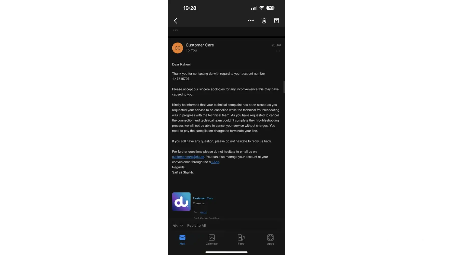 5. after du collection team is chasing me for the payment, I came to know that my account is still active and he advised me to pay AED353 but I said I will contest the amount as I feel it is unfair to pay again when there is negligence in your customer service union branch for not handling the request of termination properly.