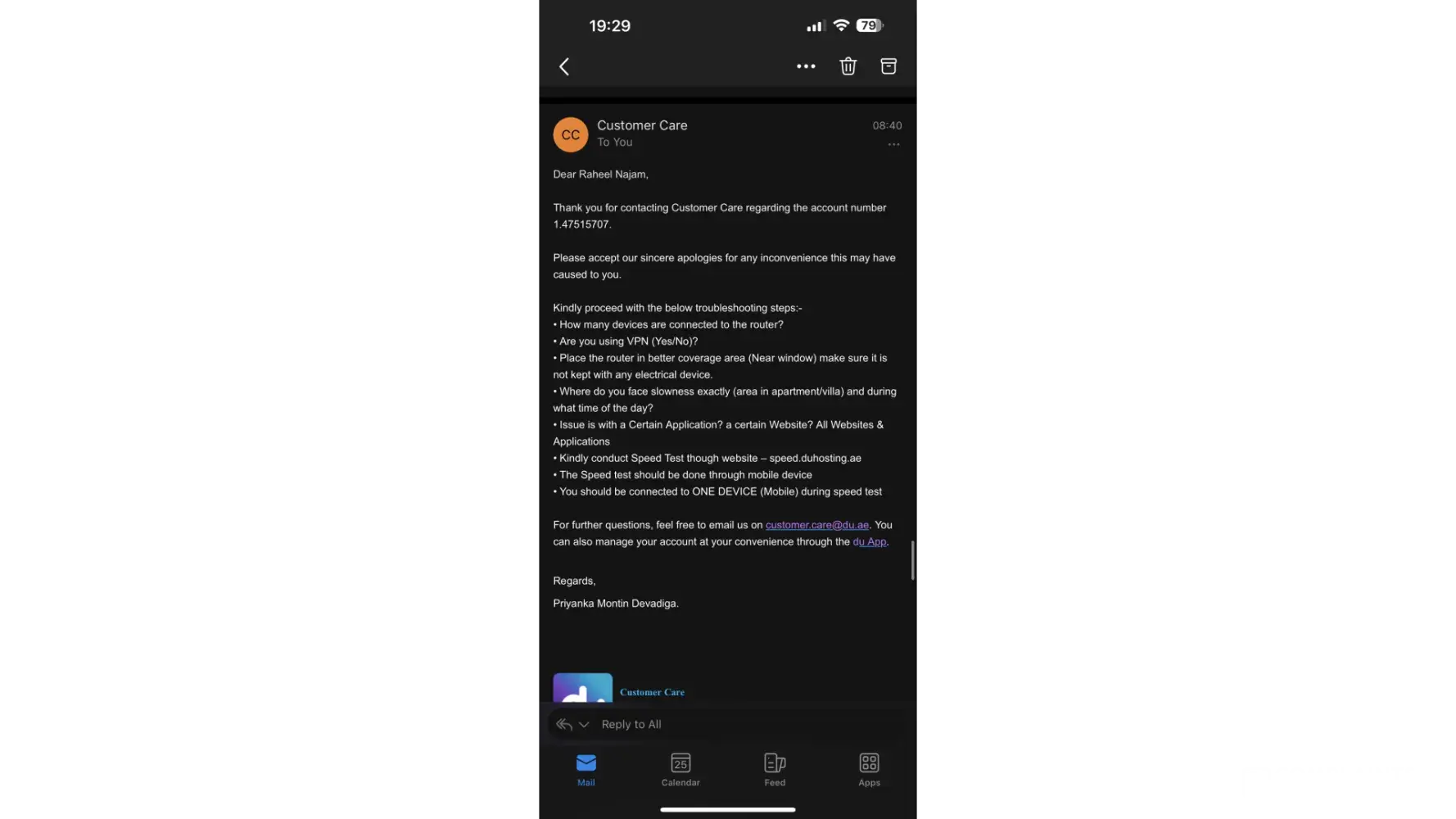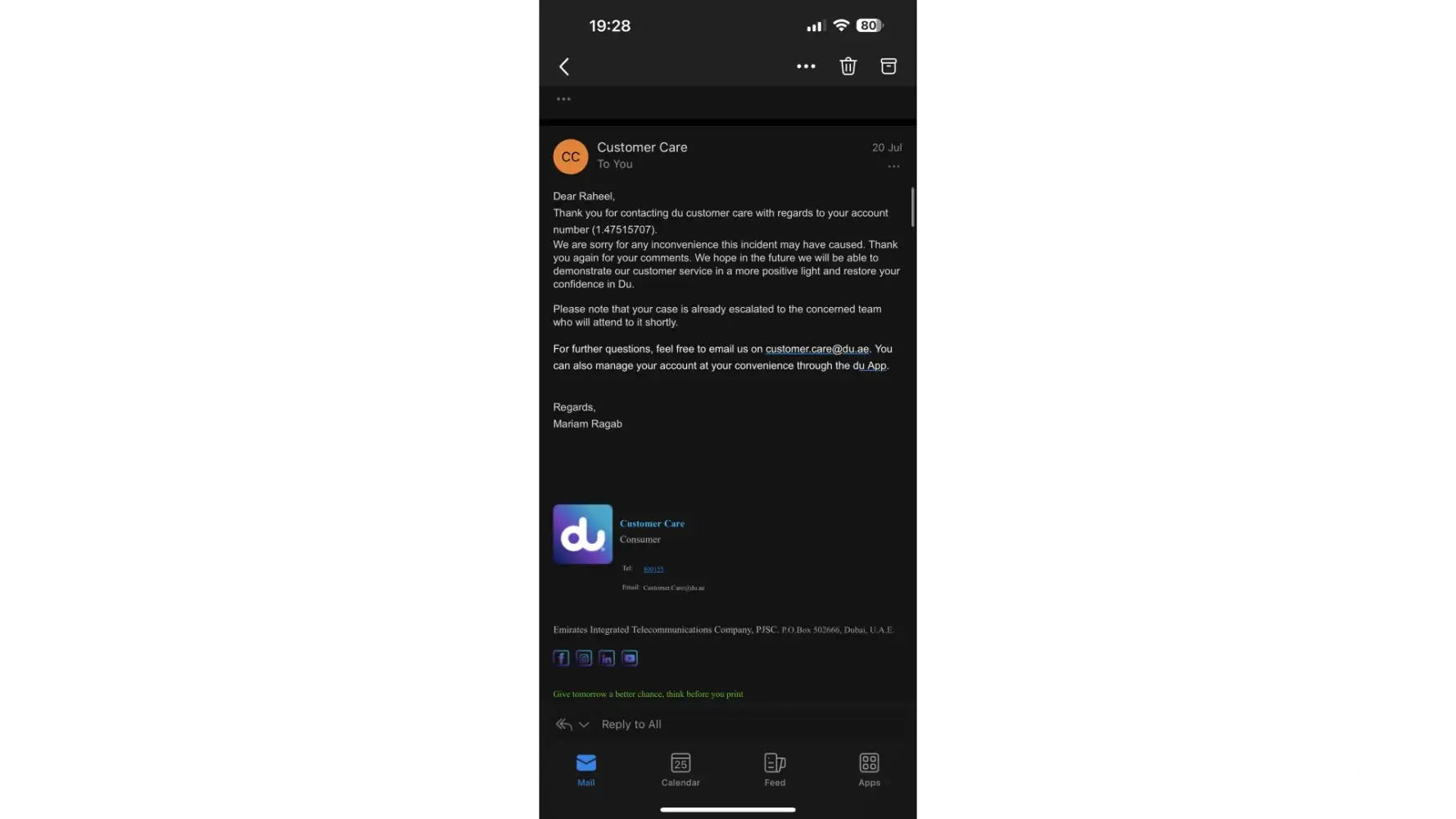 6. Even due to my hectic schedule as I am residing in Sharjah, I had visited again the Union branch to speak to the manager and lodge a complaint however again he advised me to call customer service. I informed the Manager that Customer service cannot resolve as well so the best way is to go to the branch. The manager in Union branch is cooperative with my request and wrote an email to concerned Department, he advised me that Du rep will call me within 24 hours after him writing a mail to concerned Department. I have waited for 24 hours and 48 hours but no calls from Du, so I took my initiative to follow up in calls and emails. I can say here there is No Customer Care happening here, unfortunately.