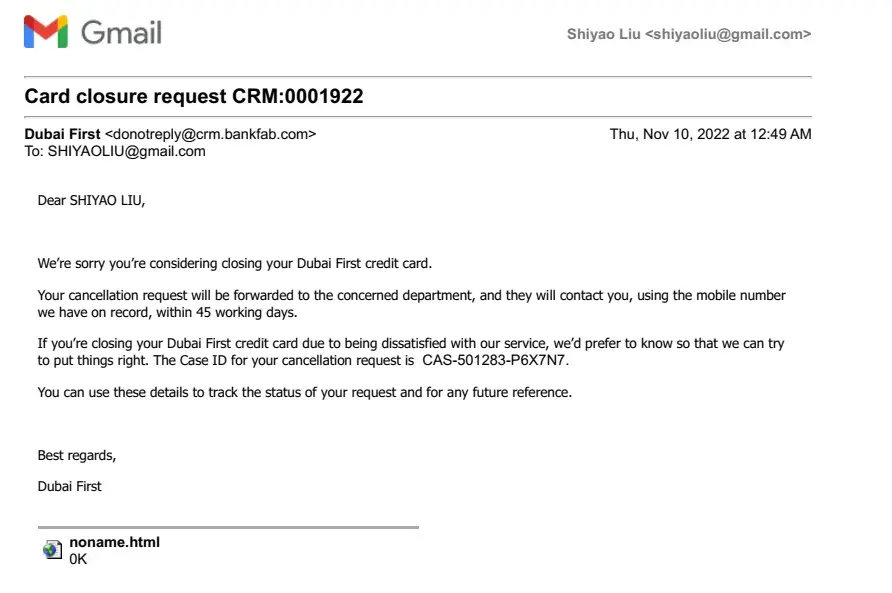I wrote to Dubai First by emailing a card closure form on 8 Nov 2022 and obtained their response on 10 Nov 2022 (CAS-501283-P6X7N7). However. up to now, I am still getting their tax invoices.