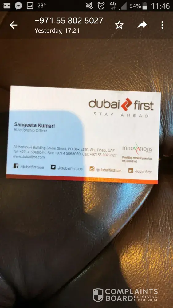 However, I got a call from her today and she started shouting at me asking why I had sent the email and that it is my responsibility to contact their beneficiary and ensure they receive the payment. Her behaviour was extremely rude and I had to disconnect the call as she was shouting at me. I have been trying to sort out this issue from my end as much as possible but I do not have a control on what the process is followed by the beneficiary of Dubai First. This seems like it has become my responsibility to sort out the issue, although it is very clear that the issue is with the payment process which Dubai First has established with their beneficiary.