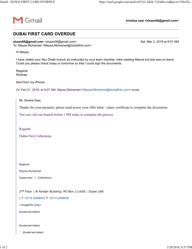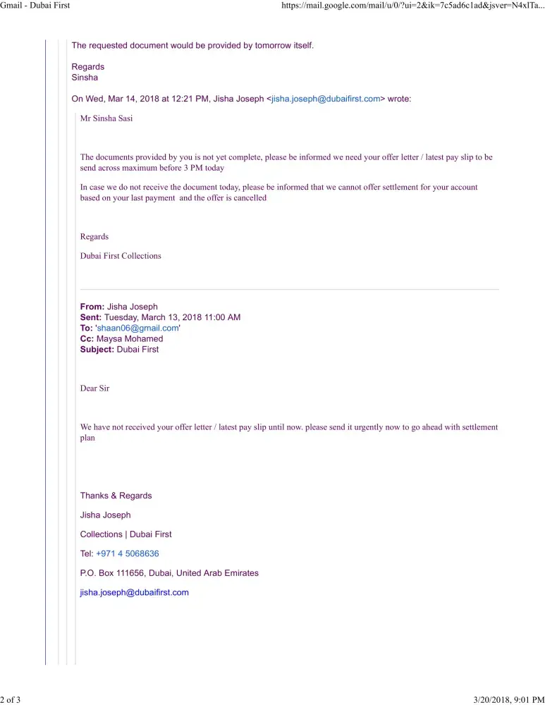 Then I had received a call from Dubai First whose name was Maysa and had a healthy conversation where she mentioned she would provide a proper settlement plan to close the issue. As per her commitment i have paid the amount to the card and provided the documents requested except for the Offer Letter which i have agreed to provide once I receive it from my HR after their internal procedure. These are all recorded through my mails. One fine day I receive a mail from Jisha stating if I don't pay before 3:00pm then the settlement plan would be cancelled. The same moment I have mailed Maysa and informed her to instruct Jisha not to mail me again and i would communicate only with Maysa. Then I received the Offer Letter from our HR and when I called Maysa she didn't pick and i had to contact Ethne for my credit card issue since Maysa was not picking my calls and replying my mails for many days and i was disappointed to know that my settlement plan has no validity any more where i had all the conversation with Maysa. After the payment Maysa has never responded to calls and mails [Find the attached mails].