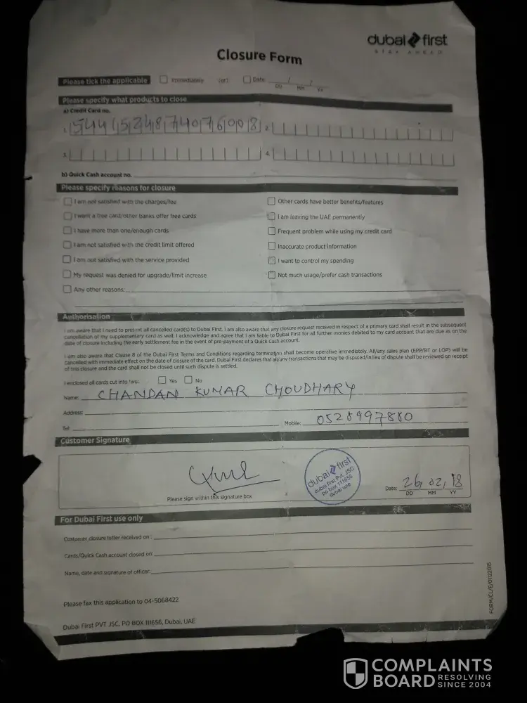 I have been very patient during this whole case but I have had enough. I would like to inform that as soon as this case is resolved, I am going to cancel my credit card with Dubai First immediately. And I will definitely share my feedback with all my relatives and colleagues, on the horrifying experience I am having with Dubai First as well as the way their employees behave with customers. I have raised a complaint with the Central Bank as well, escalating this issue.In addition they have started charging fines and late payments for the same. I also got informed that this may impact my credit scores with the Etihad Bureau, which clearly the company does not care about.