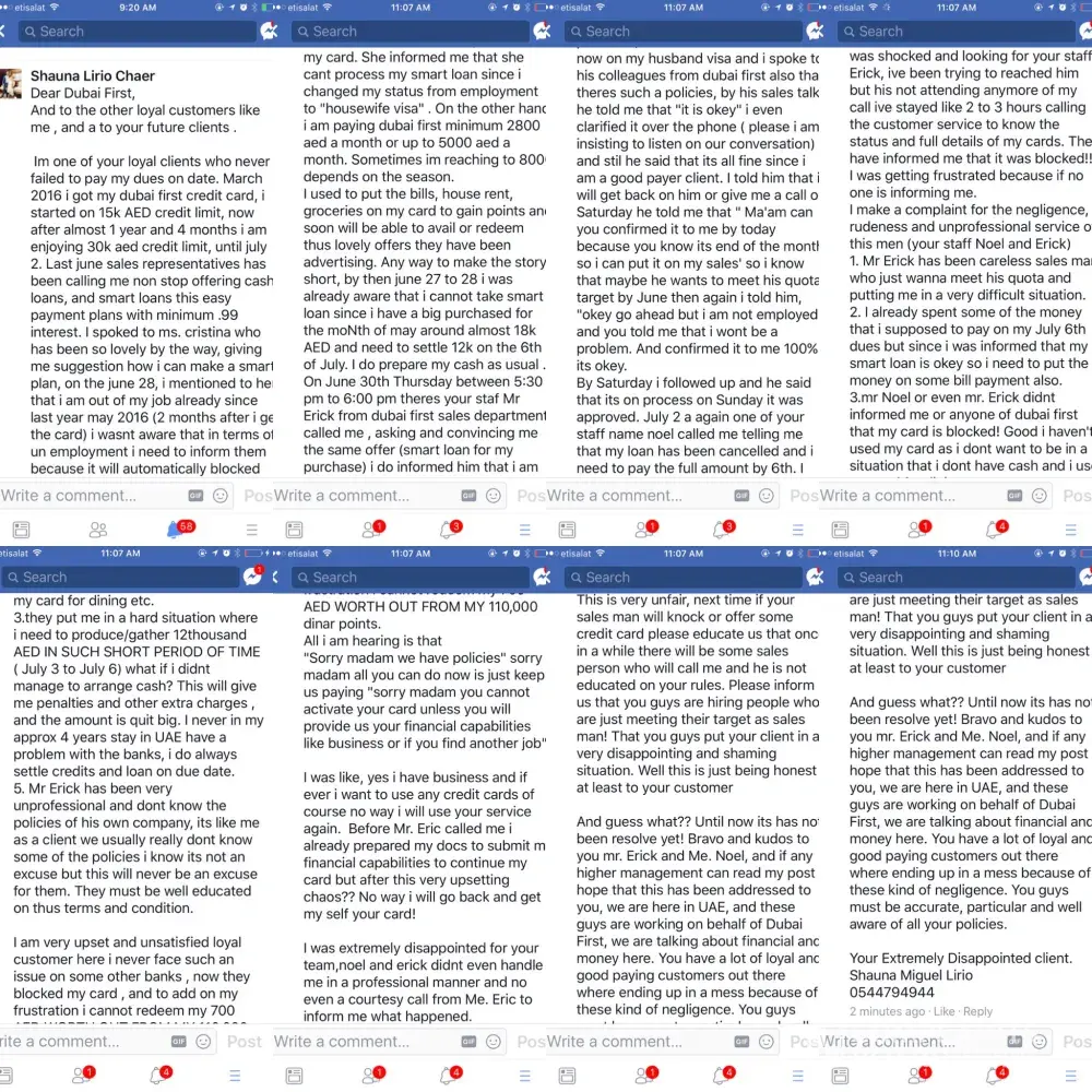I used to put the bills, house rent, groceries on my card to gain points and soon will be able to avail or redeem thus lovely offers they have been advertising. Any way to make the story short, by then june 27 to 28 I was already aware that I cannot take smart loan since I have a big purchased for the month of may around almost 18k aed and need to settle 12k on the 6th of july. I do prepare my cash as usual. On june 30th thursday between 5:30 pm to 6:00 pm theres your staf mr erick from dubai first sales department called me, asking and convincing me the same offer (Smart loan for my purchase) I do informed him that I am now on my husband visa and I spoke to his colleagues from dubai first also that theres such a policies, by his sales talk he told me that "it is okey" I even clarified it over the phone (please I am insisting to listen on our conversation) and stil he said that its all fine since I am a good payer client. I told him that I will get back on him or give me a call on saturday he told me that "ma'am can you confirmed it to me by today because you know its end of the month so I can put it on my sales' so I know that maybe he wants to meet his quota/target by june then again I told him,"okey go ahead but I am not employed and you told me that I wont be a problem. And confirmed it to me 100% its okey.