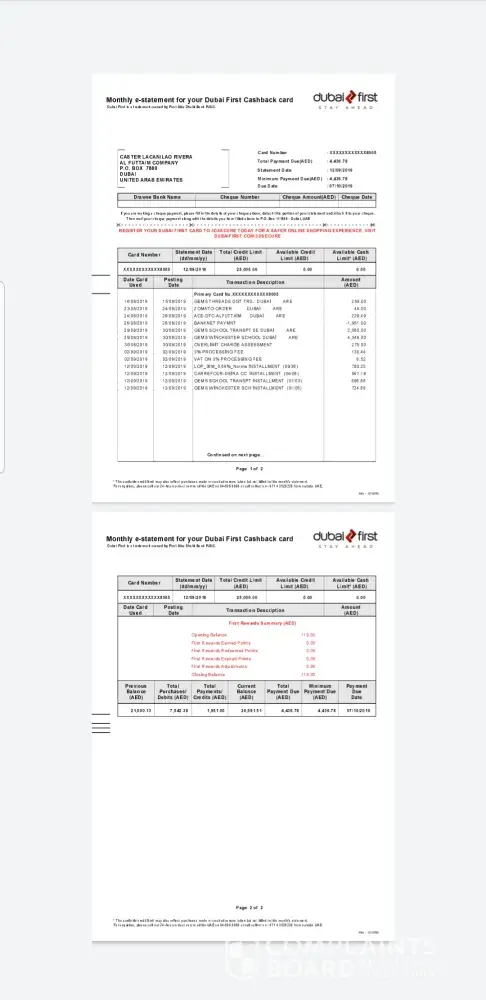 I am a Dubai first bank customer since 5years now. This is the worst credit card I have ever deal with initially they will come with high credit limit offers and other stupid offers. Then start your time to never-ending process. There charge yearly some amount which initially they say its free of charges and they have inappropriate charging of late payment fee in which none of the banks in UAE charges that way. I was thinking to cancel this card since sometimes now, finally did it. But again highly don't recommend Dubai first bank credit cards to anyone here in UAE.