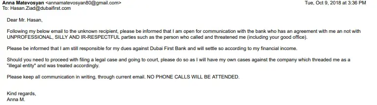 Please be informed that any further call from anyone presented from Dubai First or it's authorized 3rd party company will result in filing a police case for personal harassment with further legal actions against the person(s).