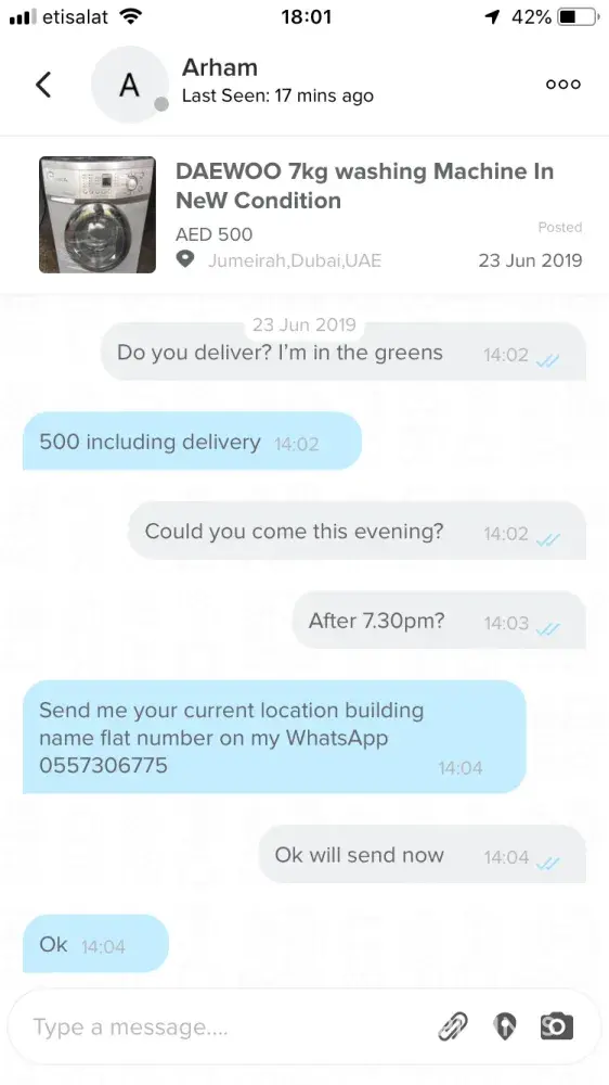 I purchased a washing machine off a seller named Arham early last week 23 June in Dubai.