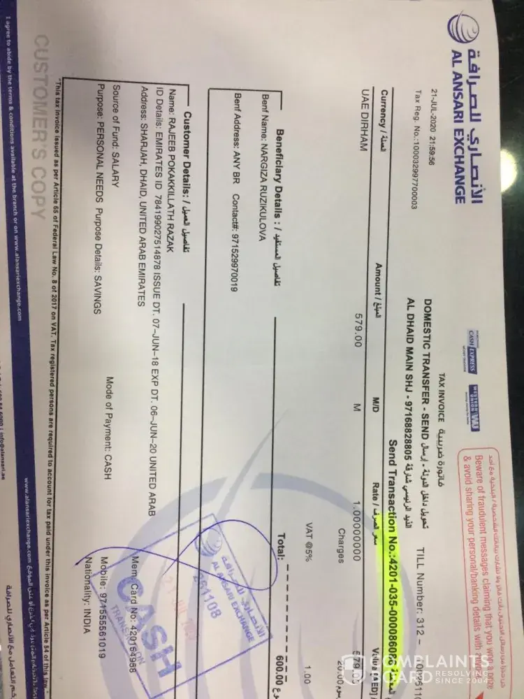 I saw one add-in Dubizzle Canon Camera and I called him, he told me please send the amount now I will send tomorrow. But still, he is not sending and not picking the phone. Actually I borrow money from my friend. He sends his Passport Emirted ID Details. And I have Al Ansari Exchange Receipt also, he received within 10 minutes.