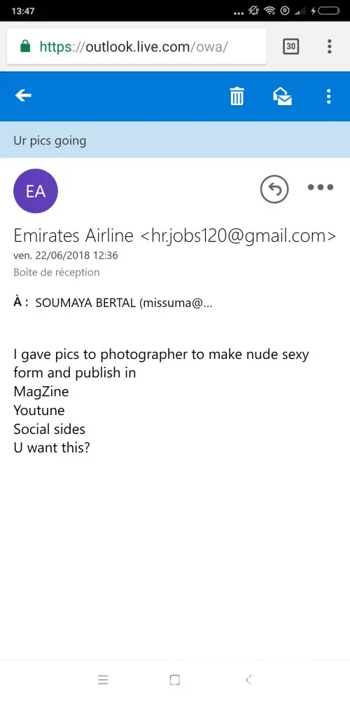 After I sent him a message telling him I will report him he sent me an email with pictures he took from the video call and harassing me that he will use my pictures and put on YouTube and naked female body in magazine.