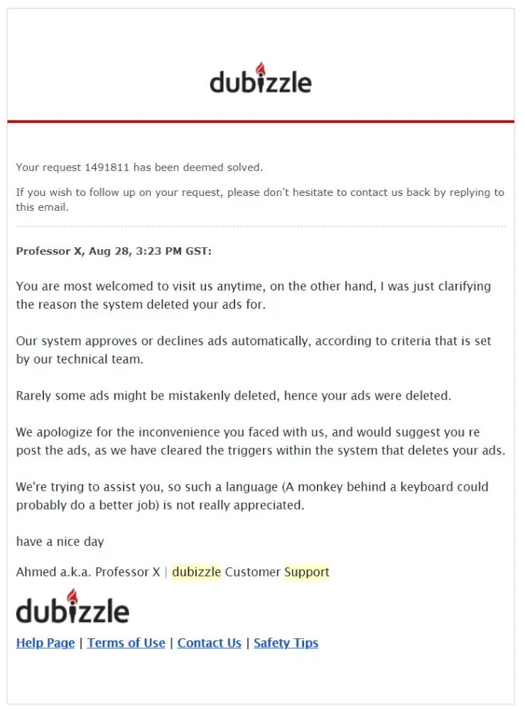 I paid dubizzle to featured my ad (same ad was there on dubizzle for almost 4 days before featuring), but when they featured my ad, within 4 hours they remove my ad and send me mail showing reasons which you can find in attached screen shot. I write mail twice on 5th/6th June 2018 for explanation but till now after 5 days passes haven't get any respond, which is truly disgusting. this behavior of you to me is not appreciated and highly condemnable. hope to hear from you soon.