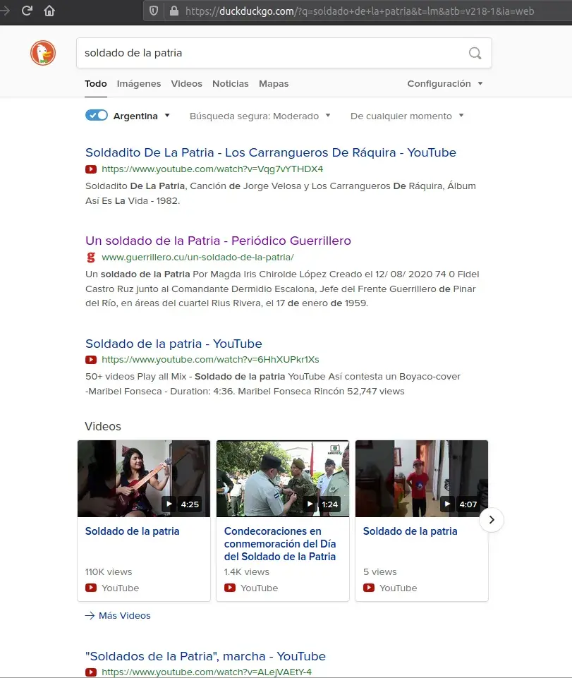 Le mando como ejemplo lo siguiente: hago una busqueda de "soldado de la patria" en argentina y obtengo una pagina llamada "el guerrillero" de cuba. Sepa ud que un guerrillero NO es un soldado de la patria en Argentina y menos un medio cubano . Asà que le recomiendo que afinen su algoritmo de búsqueda. // También he notado que al hacer búsquedas de contenidos adversos al grupo gobernante de este paÃs es infructuoso. Le recuerdo que Argentina aún NO es China y que todavÃa hay libertad de expresión lo cual no se refleja en los resultados de búsquedas en esta plataforma.