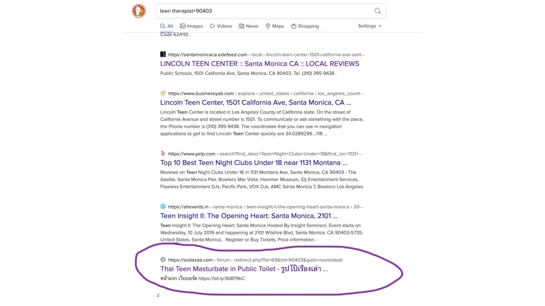 I was searching for a therapist for my child. Then I saw this disturbing result. Please remove immediately. It says "Thai teen masturbate in public toilet". This is terrible and should be removed immediately. This was placed in the wrong search as well. It is illegal content and should be reported to the authorities. I attached the search result from February 24, 2022.
