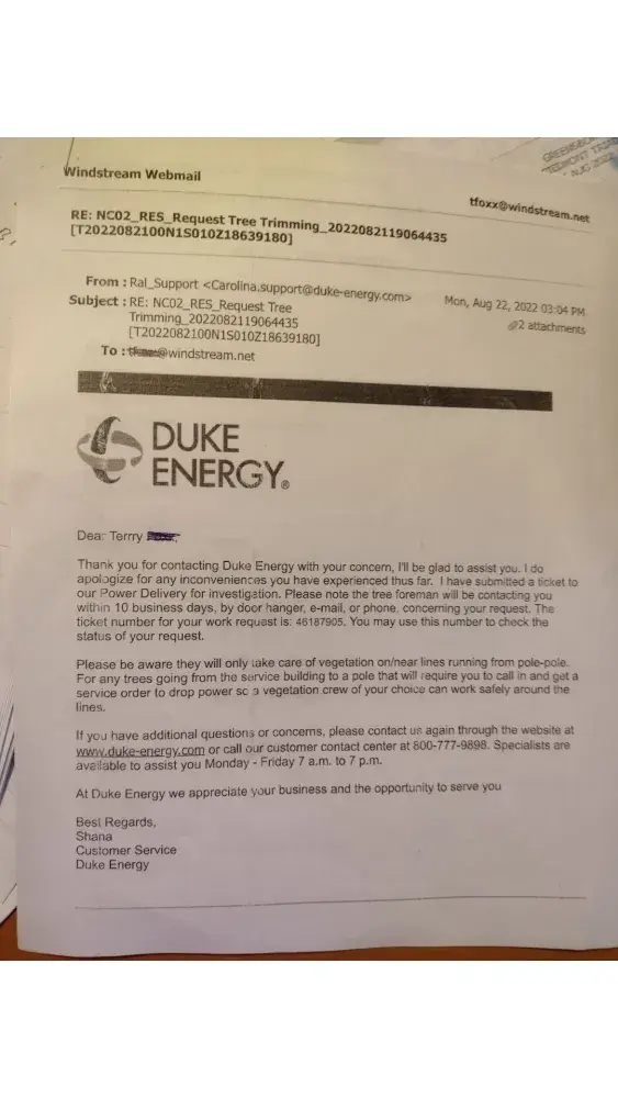 On Mon, Aug 22, 2022 customer services issued response T202202100n1s00z1863918 to me explaining the policy, procedure and standard for removing vegetation on/near lines from pole-pole. The reason for this response, was because given multiples call ins and residents requesting assistance with overgrowth in the community. Duke Energy field representative continuously review, acknowledge that overgrowth exist, but applies the standard that if the limbs are not pulling the lines down, that this neighborhood would not be service. Now I remind you that during the last August 22 storm power was lost due to a falling tree at roadside and cause property damages. Duke upon repeated requests, cannot tell me or anyone in the community when the community was last service, when will the next trimming service be after a tree trimming request has been imputed, nor why the standard of care keeps changing with each site inspection after a request has been made. A promise that a supervisor will follow-up with you has gone unfilled. This is not the service I remember from past experiences.