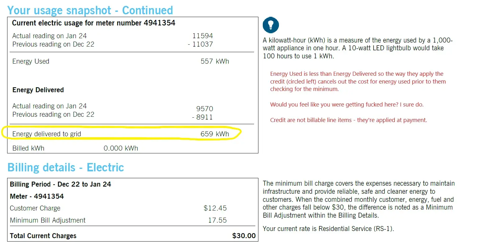 This is unfair. Flat at unfair. Credits for energy consumed is not a [censored]ing billable item - they're credits which should be used to pay for my bill. My energy consumed is about $200/mo and so it was I produce. The fact that they are applying my credits as a billable line item instead of a payment form is causing my bill to be inappropriately increased.