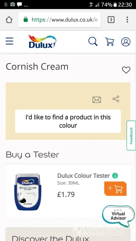 I had bought 15 litres o Cornish cream Matt paint from N&C in chadwell heath. The colour of the product is orange brown and nowhere close to a cream shade.