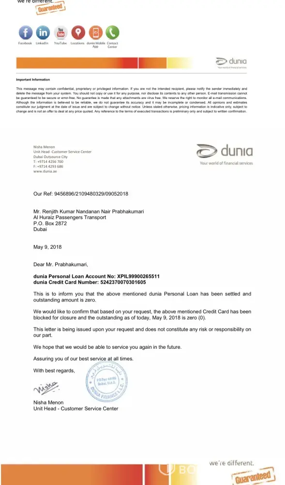 Read full complaintI got clearance letter from duniya finance. regards of my previous loan but they didn't cancelled my direct remit with rak bank
