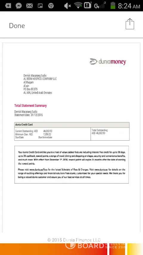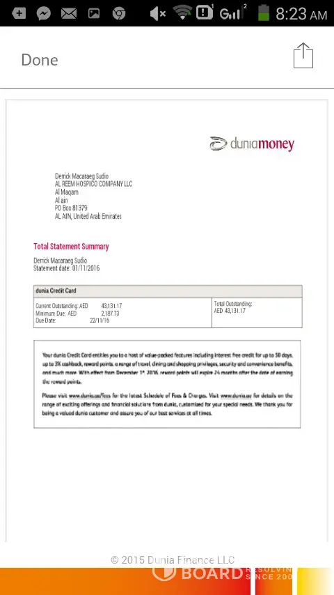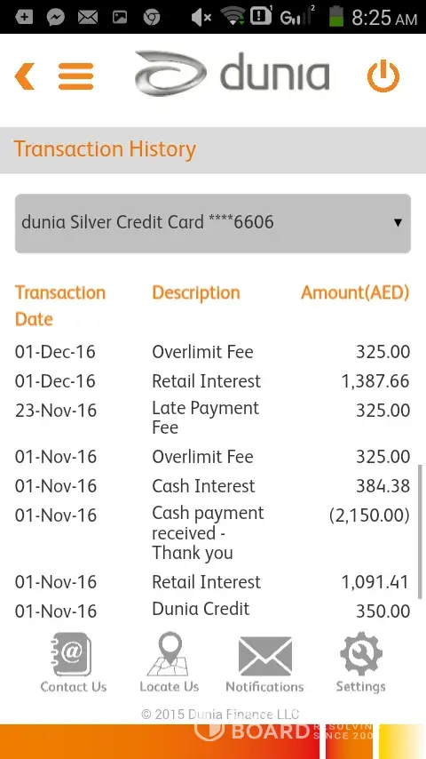In my 20 years of stay, only Dunia ruined my experienced here in Dubai! High interest+ over charges for a card that i paid the balance in full amount but still getting bills! Take note the card is inactive for 8 years! They should be out of uae they are giving nightmares to residents!