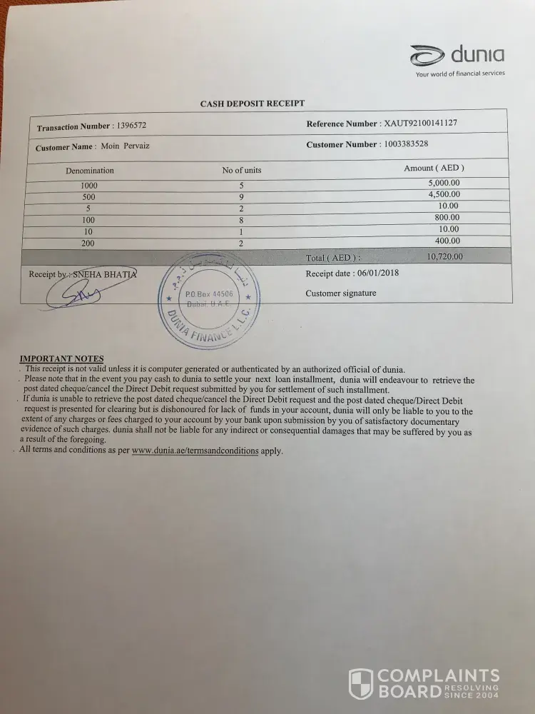 Whoever read this, if ever I turned back I will never ever take any loan from Dunia not because of the interest but because of their ungrateful staff. There are lots of bank now if your salary is 3000 better take a loan at DIB or RAKBANK rather than taking it to Dunia..