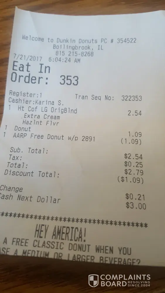 I walked this morning as usual to pick up my usual Dunkin Donuts coffee at around 6AM and really walked out very frustrated and humiliated by one of your server named Karina (receipt attached).