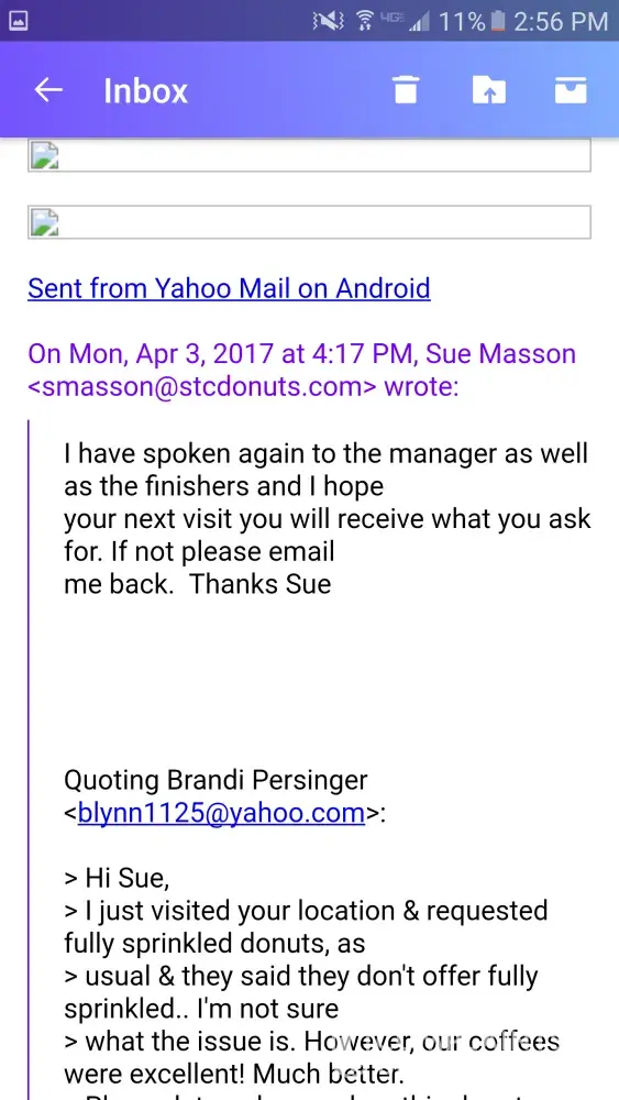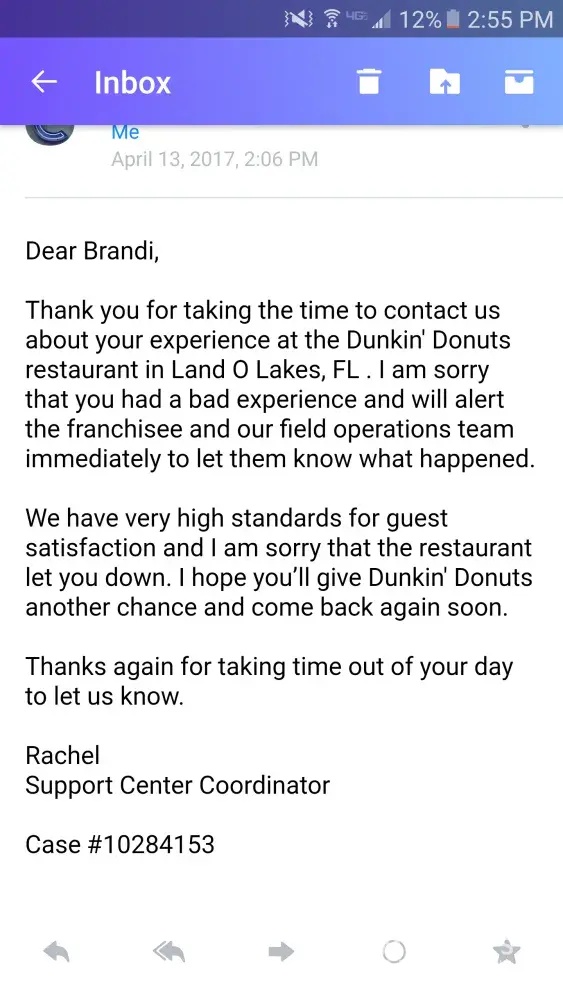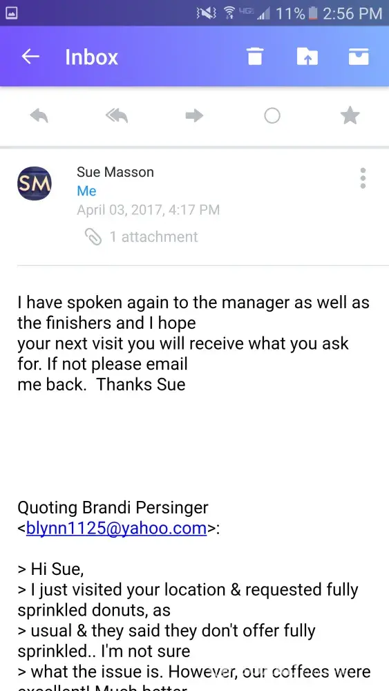 For about 4 months now, I have visited the Dunkin near me every so often. The address of the location is 16055 FL-52, Land O Lakes, FL 34638. I always get the same thing & it has only been correct a handful of times. My main issue is I order 2 chocolate frosted donuts with sprinkles. They have always been half sprinkled/partially frosted. After a long while, I became irritated that I was not getting what I pay for & that there's no quality control. Finally, I complained & was told they would contact the manager immediately & resolve this. Shortly thereafter, I received an email from a lady by the name of Sue Masson (not sure what her title is. She did not specify). She had apologized & told me, "As for the choc frosted donuts, they are made both ways, half sprinkled and full sprinkled. If you request a full sprinkled donut, they will be happy to accommodate you." However, this is not the case cause I request a fully sprinkled donut every time & I'm always told they do not offer fully sprinkled. I told her I appreciated her response & looked forward to getting what I pay for. I visited this location a couple days after our conversation & nothing had changed. I still recieved half sprinkled. I spoke with Sue again directly & she told me she would handle it. My next visit, I had finally received a fully sprinkled & fully frosted donut! Then, the next visit after that & the 4 following visits, I began receiving half sprinkled donuts again! Every single time, about 4 or 5 times total, I messaged Sue directly & emailed the customer service department via the Dunkin Donuts website. Every time, I recieved the same reply stating it would be resolved & they apologized. It has been almost a month & a half & this issue has yet to be rectified. I am so fed up with all of this & this will be the last time I reach out to Dunkin regarding this issue. I hope this will be taken care of. I plan to visit this location one last time in hopes I will recieve what I pay for. If I still recieve a half sprinkled donut, that will unfortunately be my last visit. I was told Dunkin has a high standard for customer satisfaction but that is clearly not the case. I have been patient & persistent long enough. I hope this gets resolved asap.
