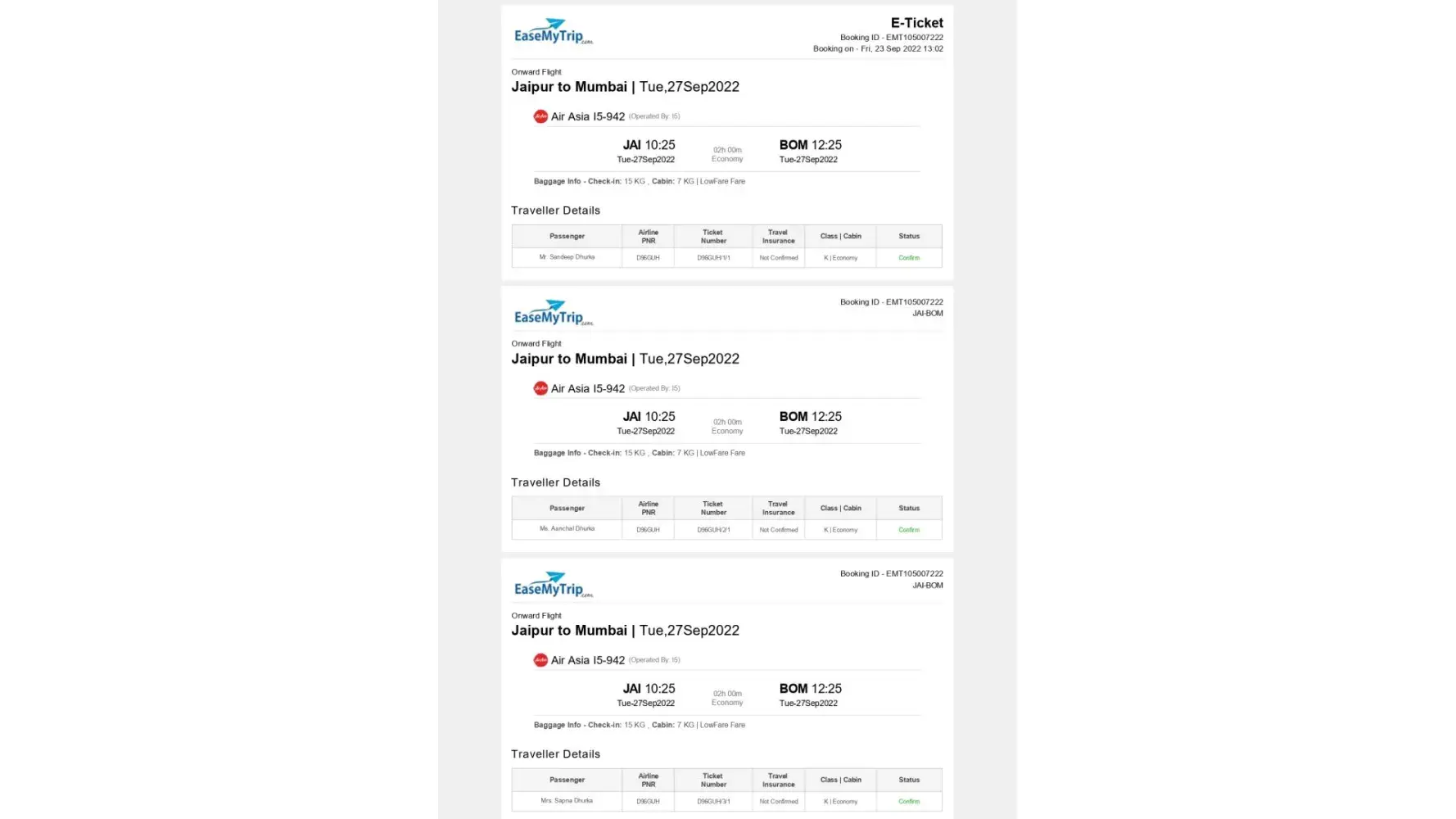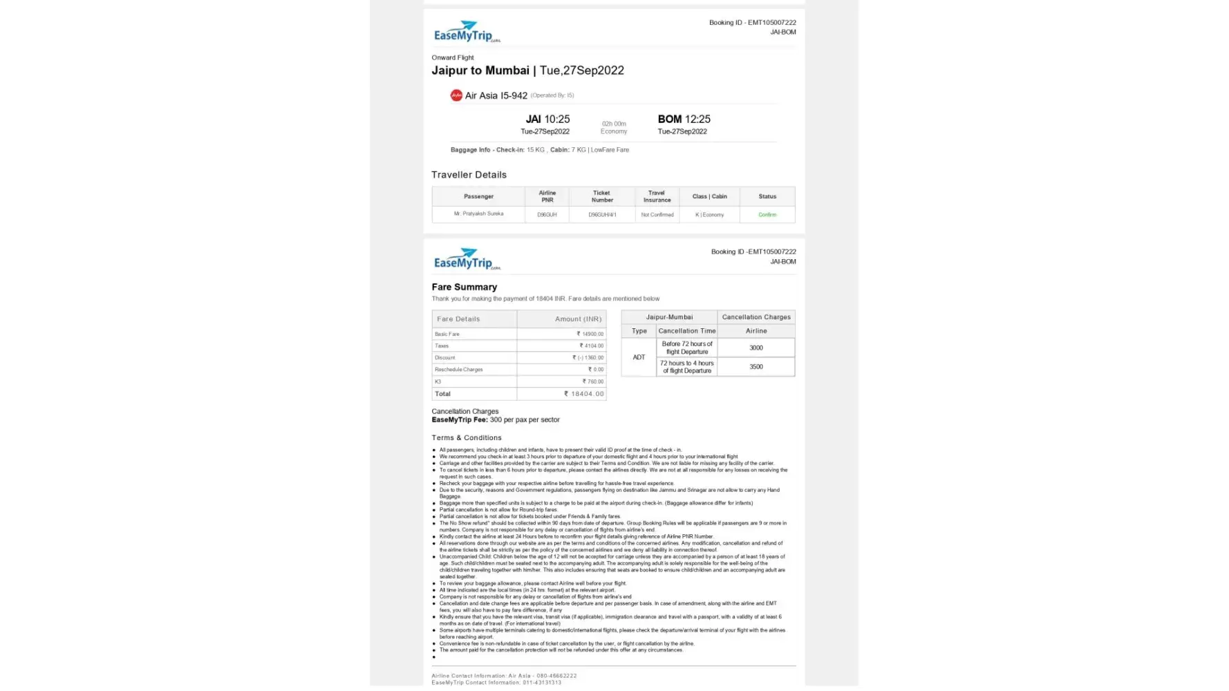 We had booked 4 tickets having Booking ID - EMT105007222 PNR No. - D96GUH on Fri, 23 Sep 2022 to visit Jaipur but suddenly due to Technical Issue our flight (Flight No :I5Â942) got canceled. Therefore, I request you to refund the total amount of Rs. 18404.00/ as per airline policy.