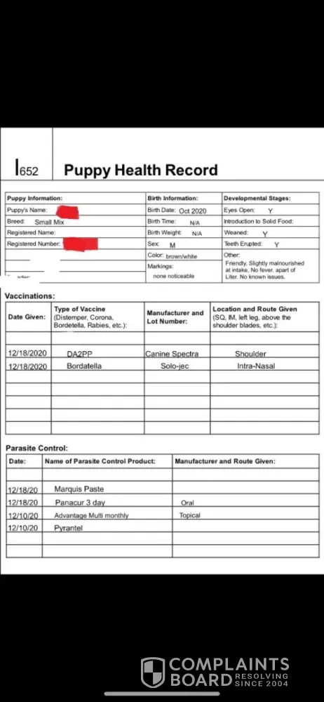 Company reuses the EXACT form I got in 2020 from East Dallas Pet Rescue (number 652) and whited out in the same areas TODAY. See mine attached. My dog from them was in NO WAY the breed mix described and came with an active flea infection, hookworms, tapeworms, giardia, and kennel cough. When I told them this, they asked how clean my house was!?