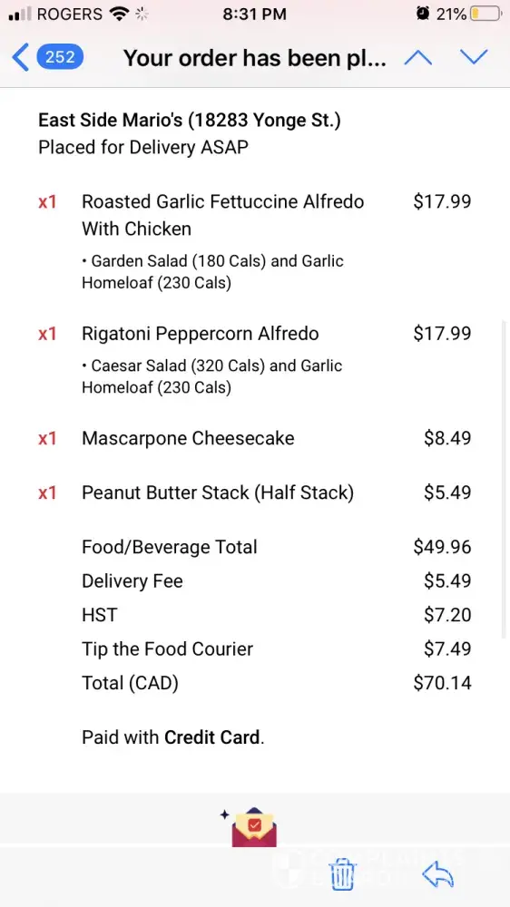 Hello, I ordered $70 worth of food (2 pastas, 2 salads, and 2 desserts) for dinner (8pm) from skip the dishes east side mario's. When it arrived we had lunch size portions. Dessert portion was half the size and the second dessert didn't come with the berries or whipped cream for the cheesecake. The one pasta we ordered the chicken was dry. The salads were...