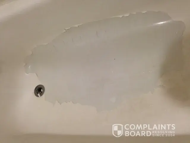 Installer forgot that there was supposed to be a non slip mat installed under the refinish after putting on an initial coat so he put the mat down and sprayed another coat. Things worked fine for 4 years 7 months and then started peeling around side of mat on bottom. Then it got worse and mat peeled off. Charlie said he wanted to see pictures before talking about scheduling work. After sending him pictures he said "1. The tub has been destroyed due to; I don't know what. 2. This kind of damage is NOT covered.