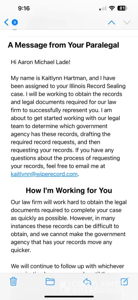 Ive been dealing with Wipe Record since July. I paid them $1000 to expunge my record. I told them early in the process I was concerned with their lack of follow-up to my emails and voicemails. I figured I would give them some time and I followed up with them in January *** the drafting stage. That was completely unacceptable to me and the paralegal that has my case has not responded to any of my emails or voicemails. I feel completely scammed out of $1000. Wipe Record has exhibited poor customer service and zero transparency. Finish the job or refund my money, its that simple. I paid them and did all the legwork that was required for them to process my case. Do your job or refund my money. This company has completely ghosted me.