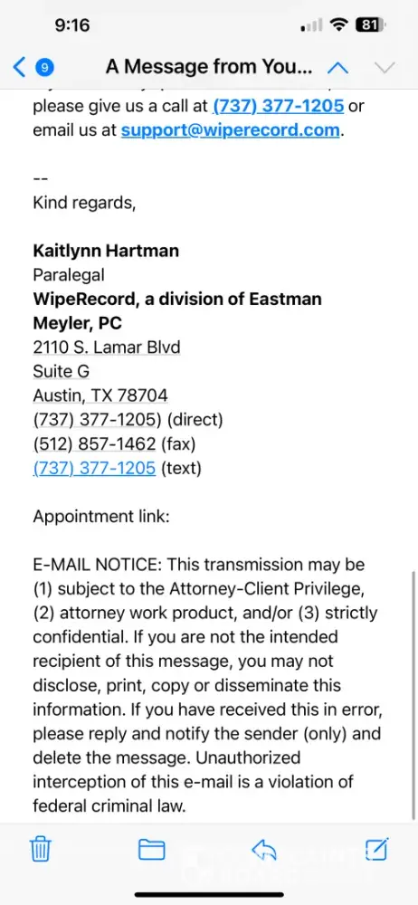 I hired this firm Wipe Record a division of Eastman Meyler in August of 2021, I have not heard from anyone there since October 2022. The paralegal handling my case feel of the face of the earth. They do not respond to emails, phone calls, or text messages. They should not be allowed to continue to practice, and be reported for lack of communication and neglect. This firm is unprofessional and unethical. A paying customer has a right to obtain case updates, I ended up hiring another attorney to complete the work this place did not do. Don't waste your money, find a local attorney.