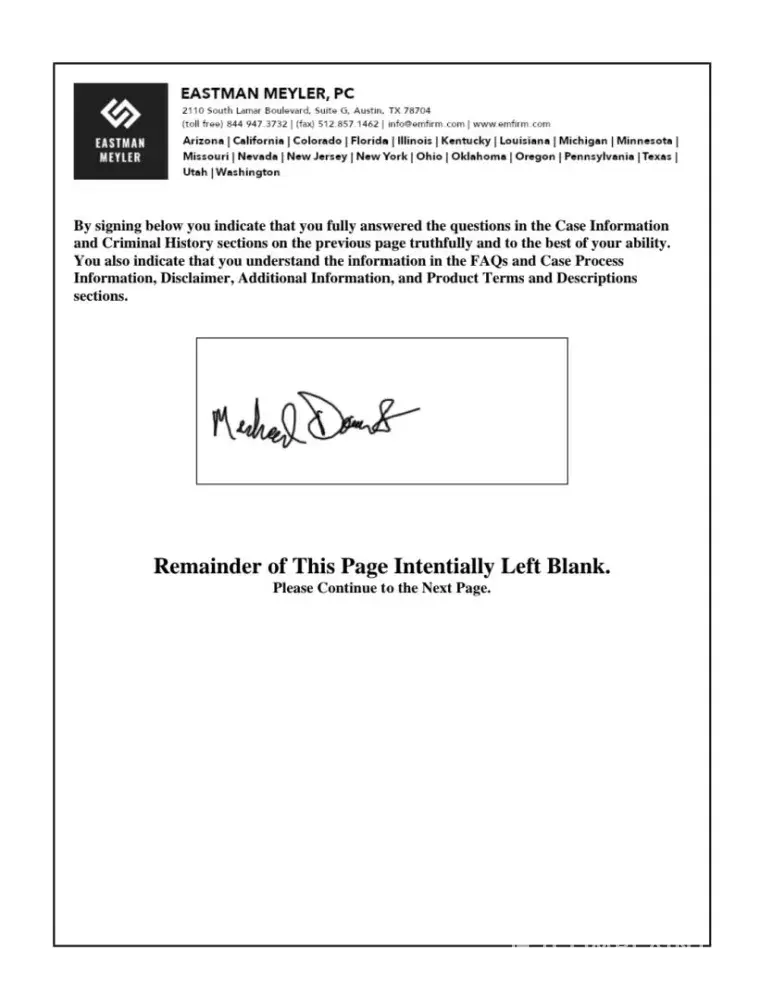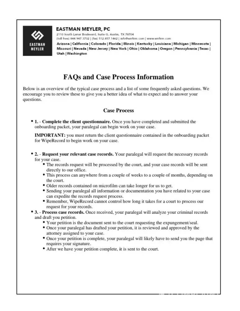 Eastman Meyler PC did a very good job in getting my criminal record sealed and assigned a very good paralegal Named Daniel B to my case I would definitely recommend using this company if your serious about clearing your record or regaining rights