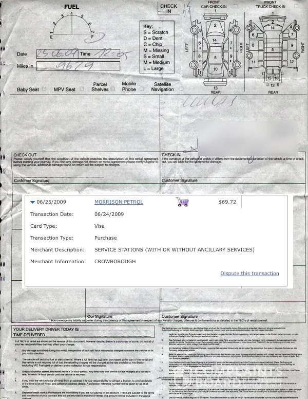 "You card statement proving purchase of the fuel is dated the 24th of June, and you returned the car on the 25th"