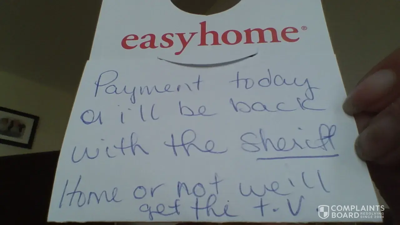 after years of regularly making payments towards our over priced products i got laid of my job and we started to fall behind. we had talked to easyhome and explained the situation and told them we would need to pay what we can and this time and catch up later. this is was the situation with our telephone provider aswell so they had suspended our services for us to let us play the catch up game. easyhome however did not want to accept this and started constantly contacting my brand new employer ( who i hadnt even told easyhome i worked for yet ) and is something that was against my company policy, to only have personal calls on an emergency basis, though i had expressed this to easy home they continued to contact my employer even after i told them they had got me written up, which eventually ended up in me being fired ! after a battle with the store manager at easyhome and apologizing to my employer i got my job back and went back to work only to receive yet another call from easyhome, aswell as several facebook messages calling me names and saying i was dodging their calls and messages - even though i had told them we cut those off for abit to catch up on more important bills like hydro and water . so now my new employer had enough of this and yet again let me go . i am now jobless, i couldnt afford my old house anymore and had to move ! since this easyhome has showed up at my home on several occasions at the crack of dawn. this morning i wake up to a note that says " payment today or i come back with the sheriff, home or not we will get the t.v ! " really ? your so unprofessional after ive paid $1500 for a $800 t.v your going to threaten to break into my home over the remaining maaaybe $600 and rob my almost paid off tv ? how do you expect people to pay if you get them fired from their jobs ? beware people easyhome is nothing but a glorified loan shark, save your time and money you can find something better at a yardsale !