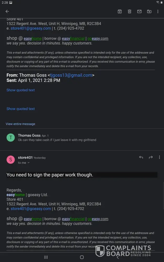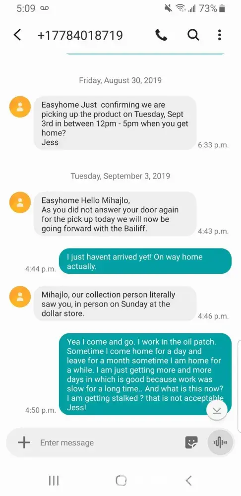 Hi im filing a complaint on go easy in red deer. I will be going to BBB as well. Mihajlo had gotten 1 day off from work on sunday. He had gotten kids some school supplies on SUNDAY WHICH GO EASY IS CLOSED. Yes we are behind and we are very sorry. But to have the red deer staff start messaging saying they seen him on sunday at dollarama, i feel like there stalking us and what happens on there time off and Mihajlos is privacy which should be respected by both parties... Someone needs to explain to these ppl that oilfield is nothing like there mon-fri jobs. They are on call 24/7 and work all hours of the night and another crew days. The company is cheap and makes them get a hotel because paying a supervisor to travel back and fourth to home and work cost them lots of money and time, and kilometers. WE DO NOT APPRECIATE THE TEXTS SAYING THEY SEEN HIM ON A DAY GO EASY WERE CLOSED THE FOLLOWING DAY THEY OPEN. AGAIN THREATENED LOCKSMITH AS WELL TO ENTER MY HOUSE. BBB WILL BE CONTACTED if nothing is done this time.