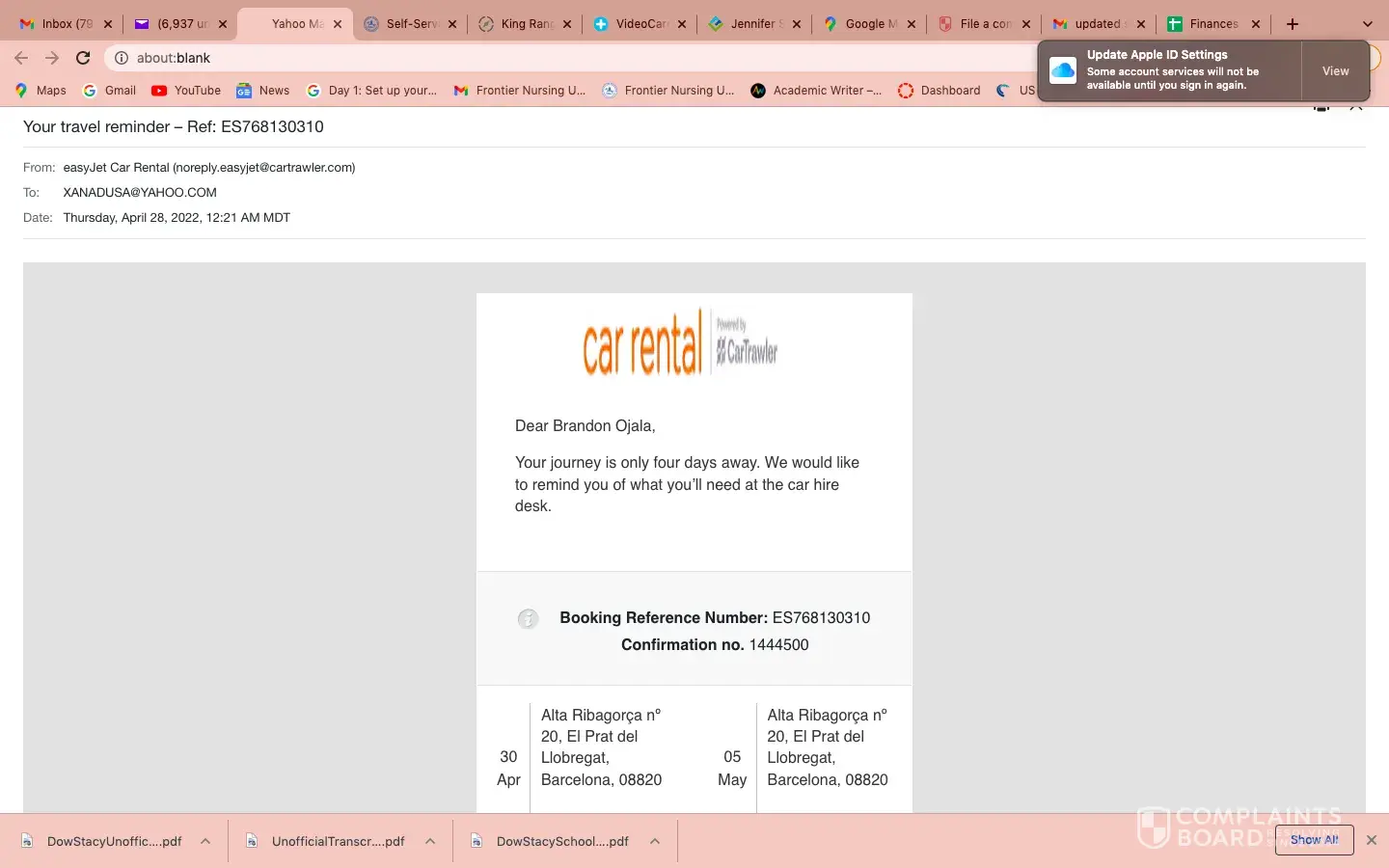 The same booking also included an 'EasyJet car rental booking' 26 April GB607513480 with EuropCar 26 April 2.05 pm and Damage Refund Insurance G001GBRGB607513480 26 April 2.13 pm, all paid for at the same time. I subsequently received 'Confirmation of your Damage Refund Insurance for your car hire - G001GBRGB607513480' with 4 pdf documents to my iPhone 26 April 2.26 pm.
