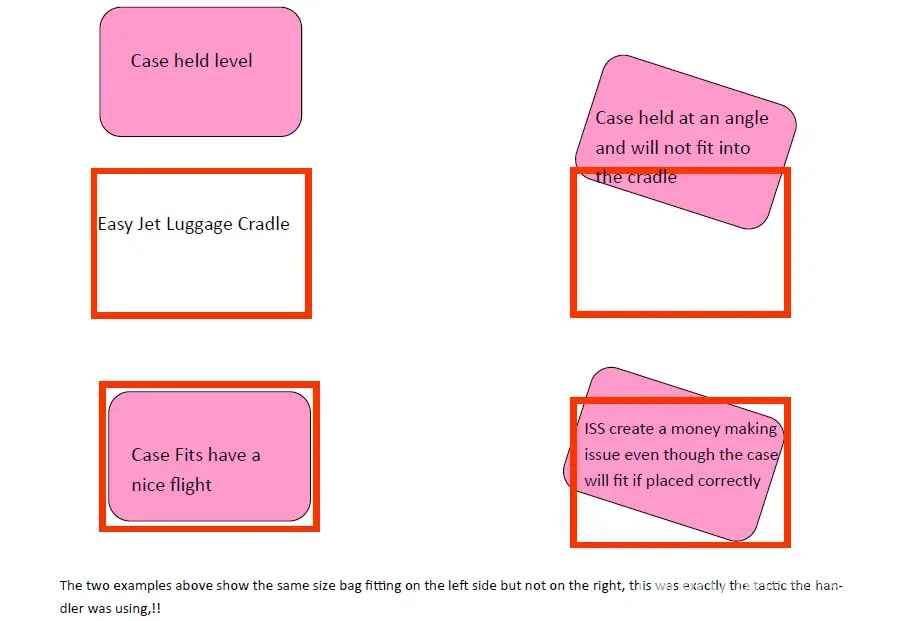 My wife was told her luggage did not fit your requirements; I explained that the cradle must be smaller as it had fitted in london and I had been careful to measure the case, from your printed t&c, before we left home. He dismissed this and said it was oversized and thus we would not be flying! I asked him to show me that the case did not fit, he refused stating it was his decision and we had to pay 50 euros or stay in vienna. Knowing that our case was in fact the correct size, my wife went to insert the case into the cradle to show the iss man it fitted, he grabbed her arm tilted the case at almost a 45 degree angle and shouted see it does not fit.